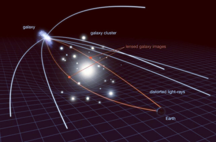 简单来讲,“爱因斯坦十字”的形成与引力透镜效应密切相关,根据广义相对论,引力的本质其实就是时空的弯曲,所以如果在观测者与观测目标之间有一个质量足够大的前景天体,那么在观测目标发出的光经过这个前景天体附近空间时,就会发生明显的弯曲,如此一来,观测者就可能看到多个观测目标的虚像。