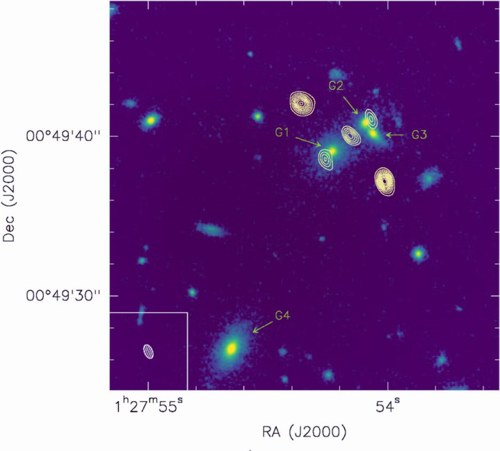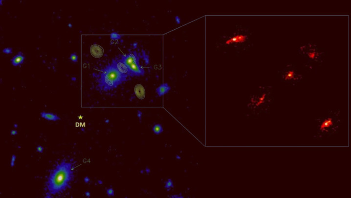 而在经过一系列的观测之后,他们发现,在“HerS-3”和地球之间,距离我们大约78亿光年的区域,确实存在4个星系(下图中的G1至G4)。