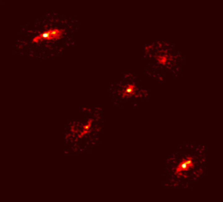 根据一项近日发表在《天体物理学杂志》上的新研究,科学家利用位于阿尔卑斯山的“北部扩展毫米波射电望远镜阵列”(NOEMA),以及位于阿塔卡马沙漠的“阿塔卡马大型毫米/亚毫米波阵列”(ALMA),在大约117亿光年外,发现了五个看上去一模一样的星系(如下图所示)。
